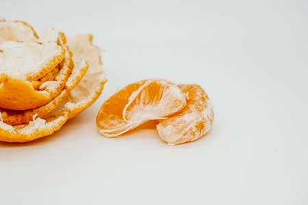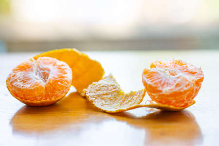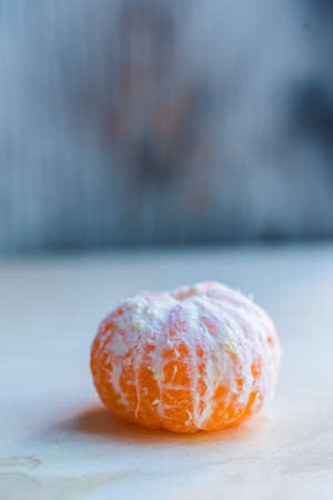 Removed peel from the ripe fruit of a sweet mandarin on the table.