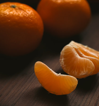 Mandarins displaying their vibrant orange color, offering refreshing and nutritious segments on a rustic wooden background