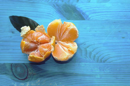 close up view of two opened mandarines on blue wooden background