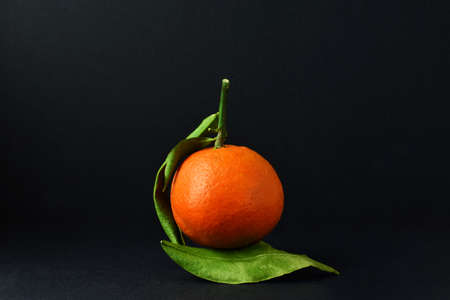 Close up, tangerine with its leaves, front view, black background.