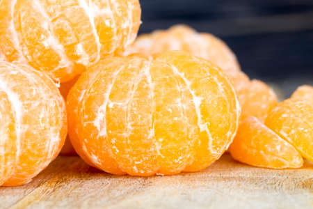 Close up peeled tangerine on wooden cutting board