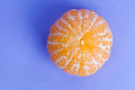 Fresh peeled mandarin orange on blue background. Top view.