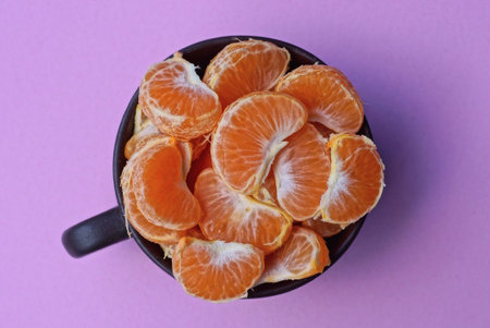 flesh of sweet and ripe orange close-up, useful citrus fruit, orange on a purple background