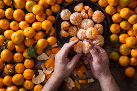 A woman in a brown woolen jacket is peeling a ripe delicious tangerine from an orange peel. Healthy fruits. Citrus fruits for Christmas. New Year's mood.