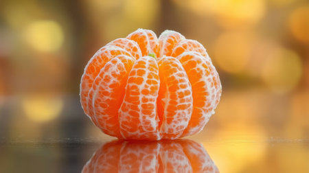 A stunning close-up image of a vibrant mandarin orange showcasing its intricate texture and glossy surface on a reflective backdrop with gentle bokeh lights.