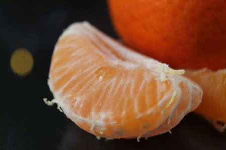 slice a piece of tangerine close-up. Orange citrus with white veins. food close-up.