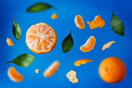 Flying tangerine fruit with slices, peel and leaves. tinting. selective focus