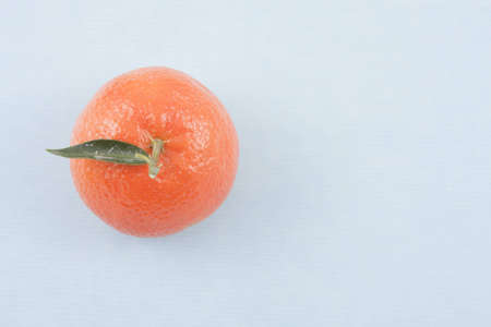 Orange fruit with green leaf on bright blue paper
