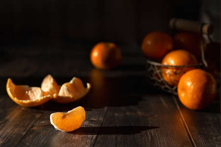Fresh tangerines in the basket. Peeled sliced Tangerine orange and on a Black Background. Citrus background.