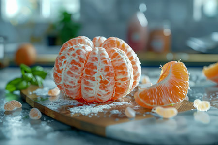 Fresh Peeled Tangerine on Wooden Cutting Board with Icing Sugar and Citrus Segments in Kitchen Setting AI Generative