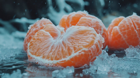 Refreshing closeup of citrus segments on ice with a dynamic water splash. Ideal for food photography, this image captures freshness and vitality.