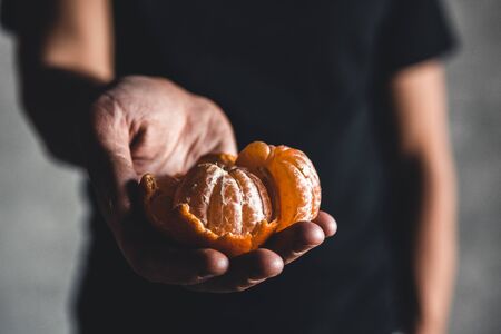 Close-up of yummy healthy mandarin fruit. Macro shot of man holding bright orange tangerine on camera. Copy space in right side. Exotic delicious snack concept
