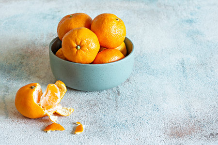 A bowl with fresh mandarin oranges fruit or tangerines (citrus) on a blue (gray) background.