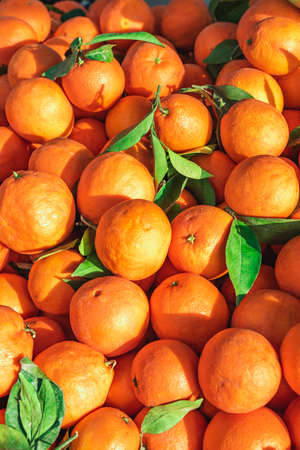 tangerines with green leaves background, fresh fruits