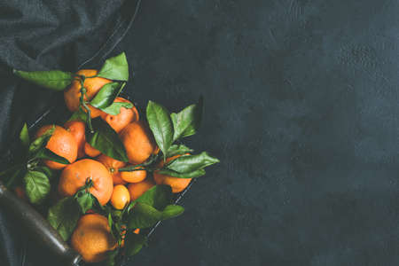Fresh mandarin oranges or tangerines with leaves on textured dark background