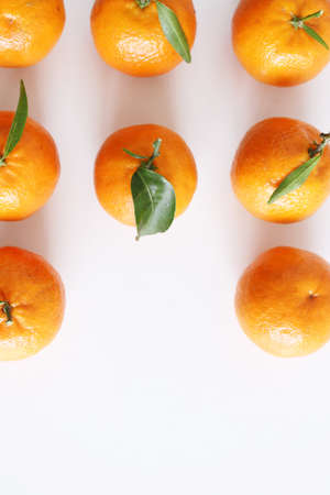 Mandarin, tangerine, clementine with leaves isolated on white background. Top view Natural food. Fruit for juices and jellies. Food concept.