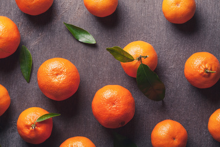 Above view of juicy orange colour mandarins with green leaves is laying on vintage wooden table.