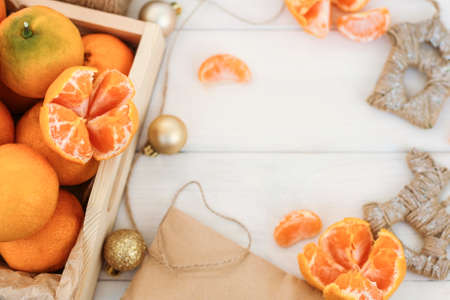 composition with tangerines (oranges, Clementines, citrus) on a white wooden background. Cones, Christmas toys, box of mandarins doing the festive mood, the space for copy.