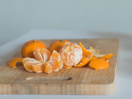 Mandarin on wooden board, blurred background.