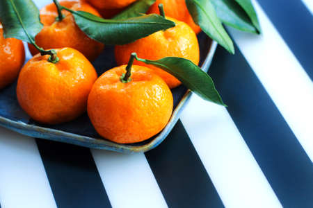 Tangerines with leaves on plate - citrus fruits and healthy eating flatlay styled concept