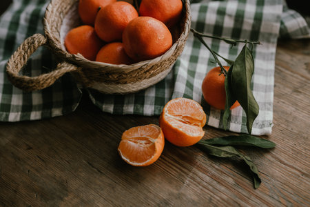 Basket of Tangerines on a wooden table. Delicious and beautiful Tangerines. Citrus background. Mandarins Tangerine Closeup. Rustic style