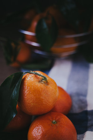 clementines or tangerines or mandarin oranges on rustic wooden table with selective focus