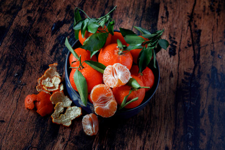 Mandarins with green leaves. Some orange tangerines with leaves lie on a dark wood textured surface. One of the tangerines is peeled. Selective focus. Dark photo. Copy spase
