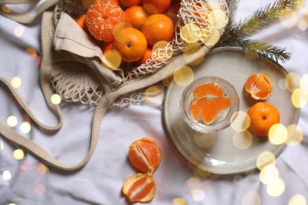 Fresh ripe tangerines, glass with sparkling wine and fir branch on white bedsheet, flat lay. Bokeh lights