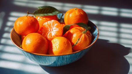 Fresh tangerines in blue bowl with sunlit stripes on table.