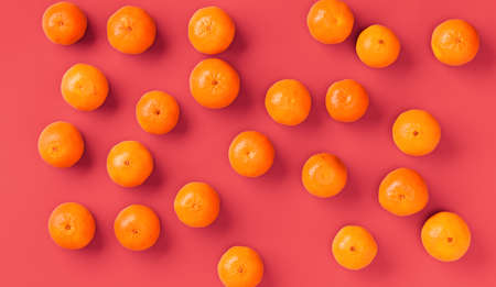 Fruit pattern of fresh orange tangerine or mandarin on living coral background. Flat lay, top view. Pop art design, creative summer concept. Citrus in minimal style.