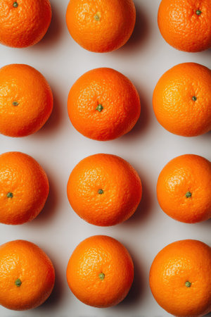 Bright oranges arranged in a perfect grid pattern, captured from above. The flat lay studio setup highlights vivid color contrast and modern design with soft, even lighting.