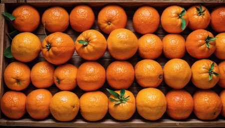 Fresh tangerines in a wooden box. Top view. Tangerine background.