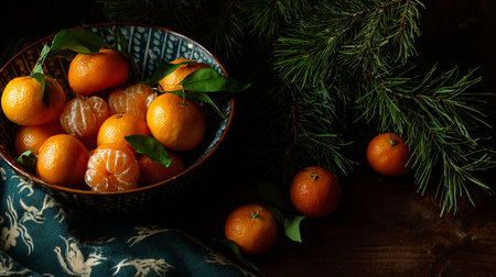 Tangerines with green leaves on a dark blue background with fir branches. A concept featuring fresh and healthy citrus fruits for the winter season in a rustic style. Copy space.