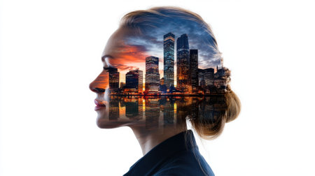 Portrait of a young woman. Conceptual artistic close-up image against the background of a city with double exposure and visual effects. An advertising move.