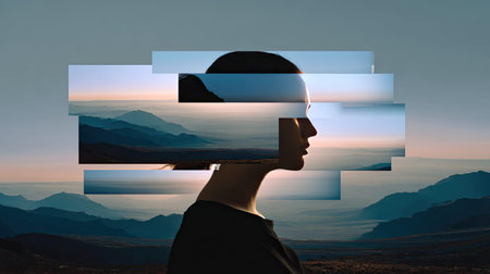 This surreal portrait features a woman's silhouette creatively overlaid with tranquil mountain landscapes in soft hues, evoking a sense of serenity and contemplation.