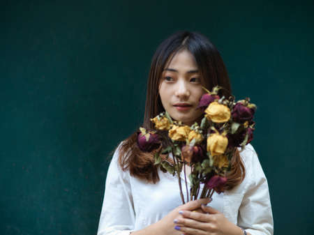 Portrait of young beautiful female holding dried roses while standing in dark green background