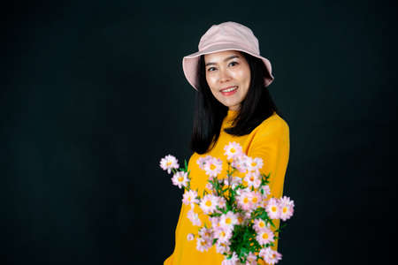 Portrait of an Asian woman in a clear yellow shirt holding flowers against a black background smiling happily in the studio looking at the camera.