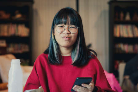 happiness face of asian teenager eating snack in home living room