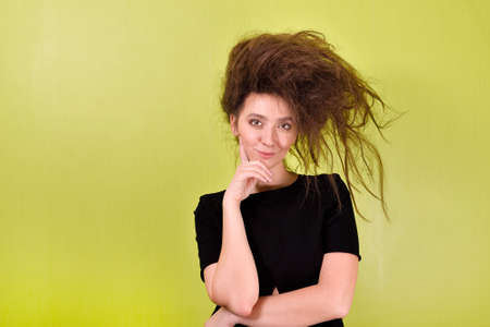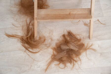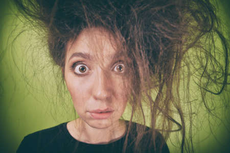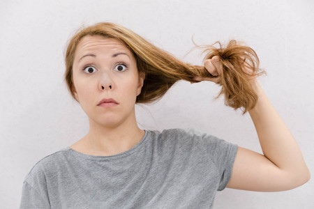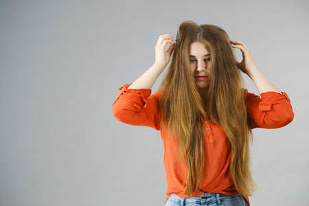 Dry and damaged hair, Hair loss problems cause by heat hair styling tools (straightener), Funny girl and bad hair day. (Selective Focus)
