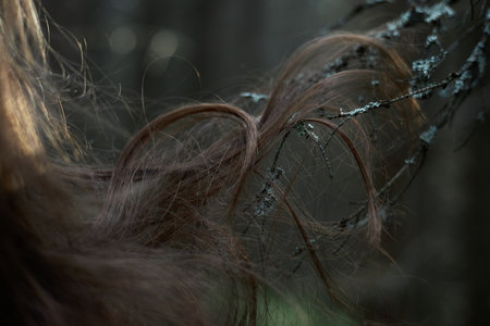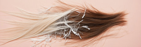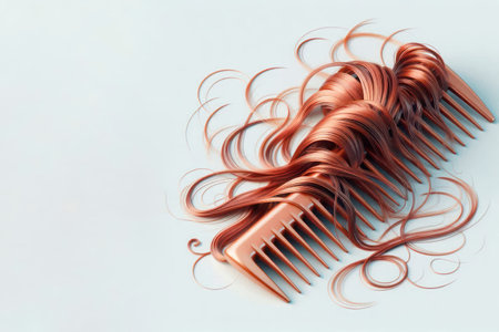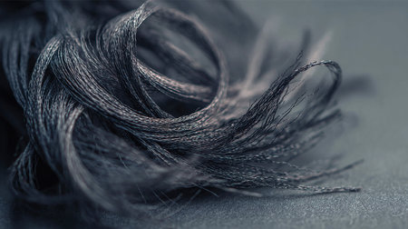 Close up view showcasing the fine details of a broken hair strand curling elegantly against a soft blue backdrop in natural light.