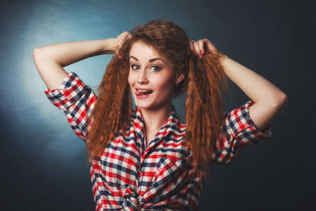 a young beautiful red haired woman in gray sweater funny takes her hair in hands and smiles silly lady