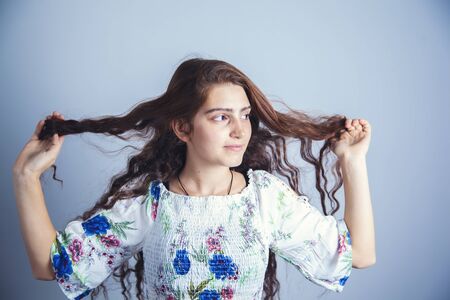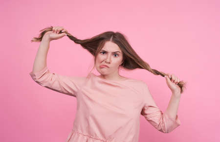 Portrait of a cute teenage girl looking at her hair. Studio portrait on a pink background. Beauty, hairstyle.
