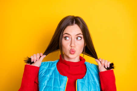 Photo of cute pretty girl touch her haircut enjoy smooth silky hair look copypace send air kiss wear season clothes isolated over bright shine color background