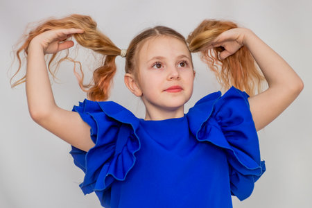 Portrait of a girl 10 years old on a blue background. Teenager girl 9 or 10 years old