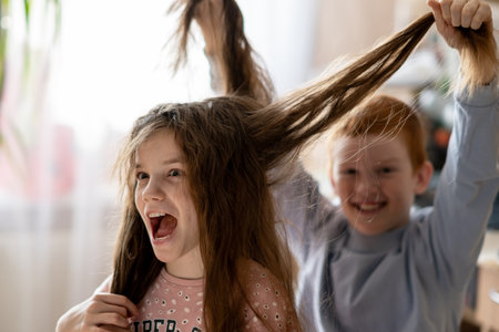 Brother and sister sitting on the sofa in front of a Christmas tree. The boy is combing his sisters hair. Family values