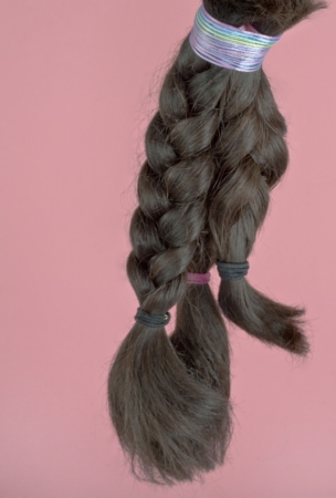 Three black braids wrapped together against pink background ready to be sent to a charity