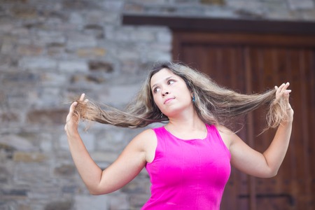 Young Caucasian girl with a bite lip, funny expression on her face, grimacing, keeps stretching her hair in her arms in different directions, fooling around with her hair, in a pink sweater.