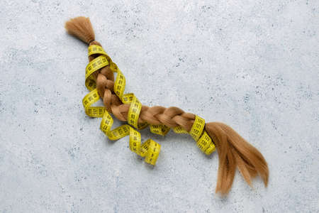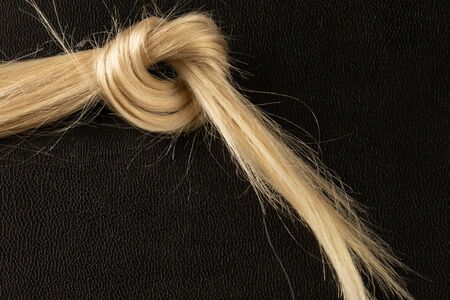Cut length of brown hair tied and ready for donation to charity for people with cancer or hair loss to make wigs and head covering