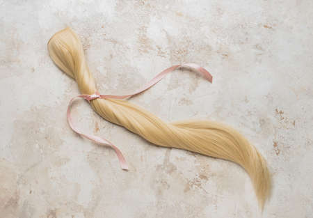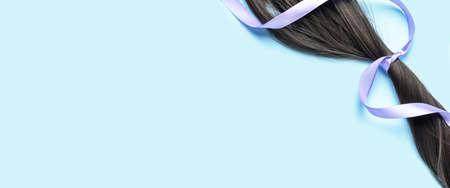 long blond hair donation put like heart with lavender ribbon as symbol of fight against cancer, white background. Top view. Natural material for making wig for patients Horizontal isolated copy space