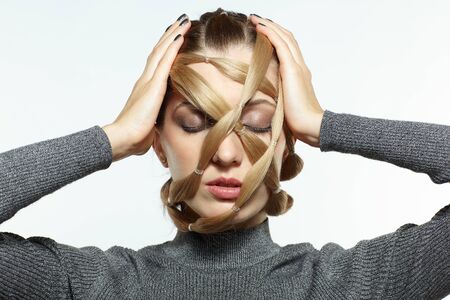 Portrait of beautiful young dark blonde woman. Female with creative braid hairdo on gray background. Girl with hands on head. Strands of hair are on face.